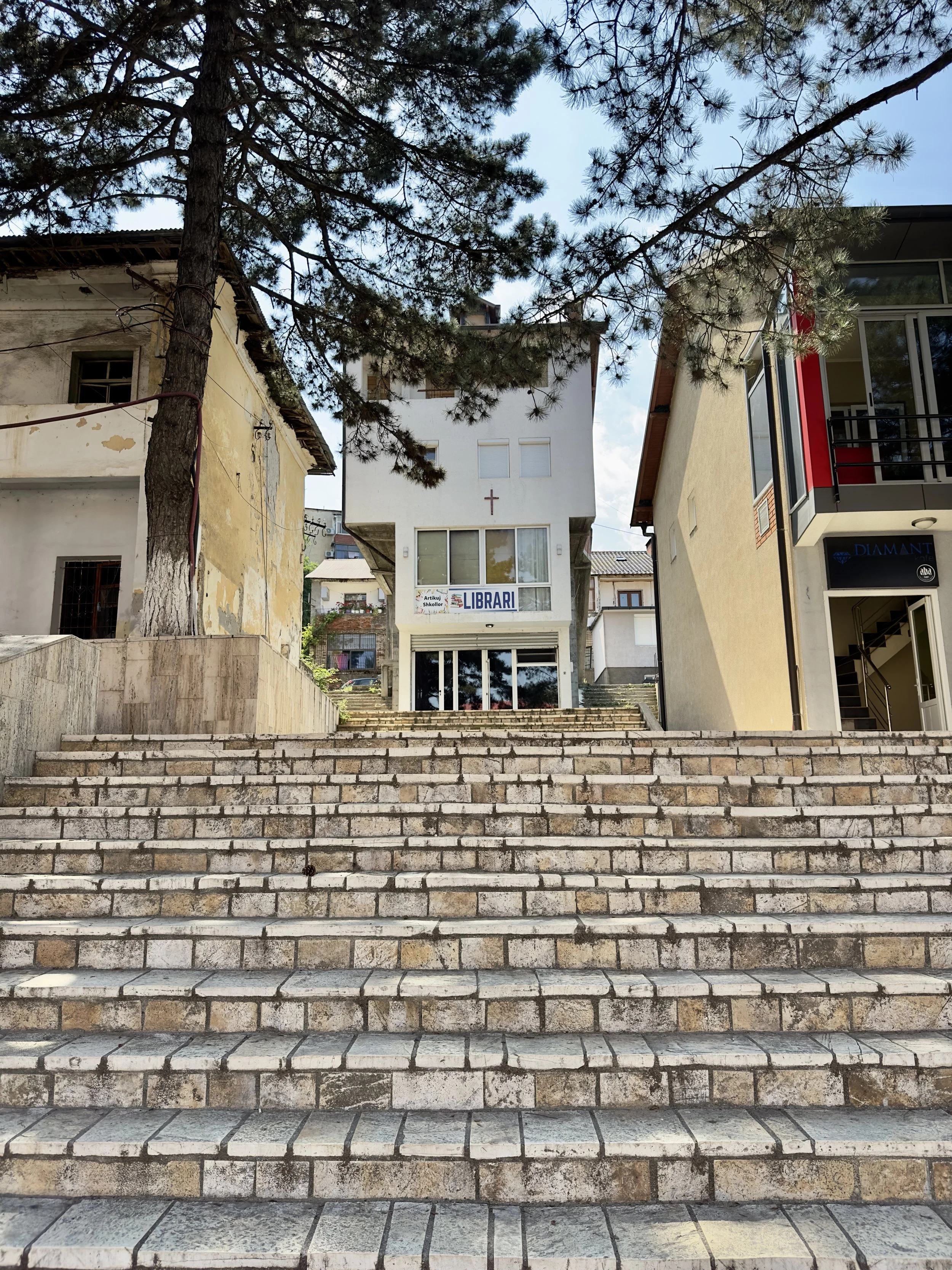 From the square, we wandered down a quiet street lined with pine trees. The midday sun hit the pale façades of the buildings, most of them solid, square, and unmistakably communist in style. There was a kind of symmetry to them, softened now by time and vines creeping up the walls. The air smelled faintly of pine resin and dust. A few locals passed by slowly, greeting one another with the unhurried rhythm of small-town life.