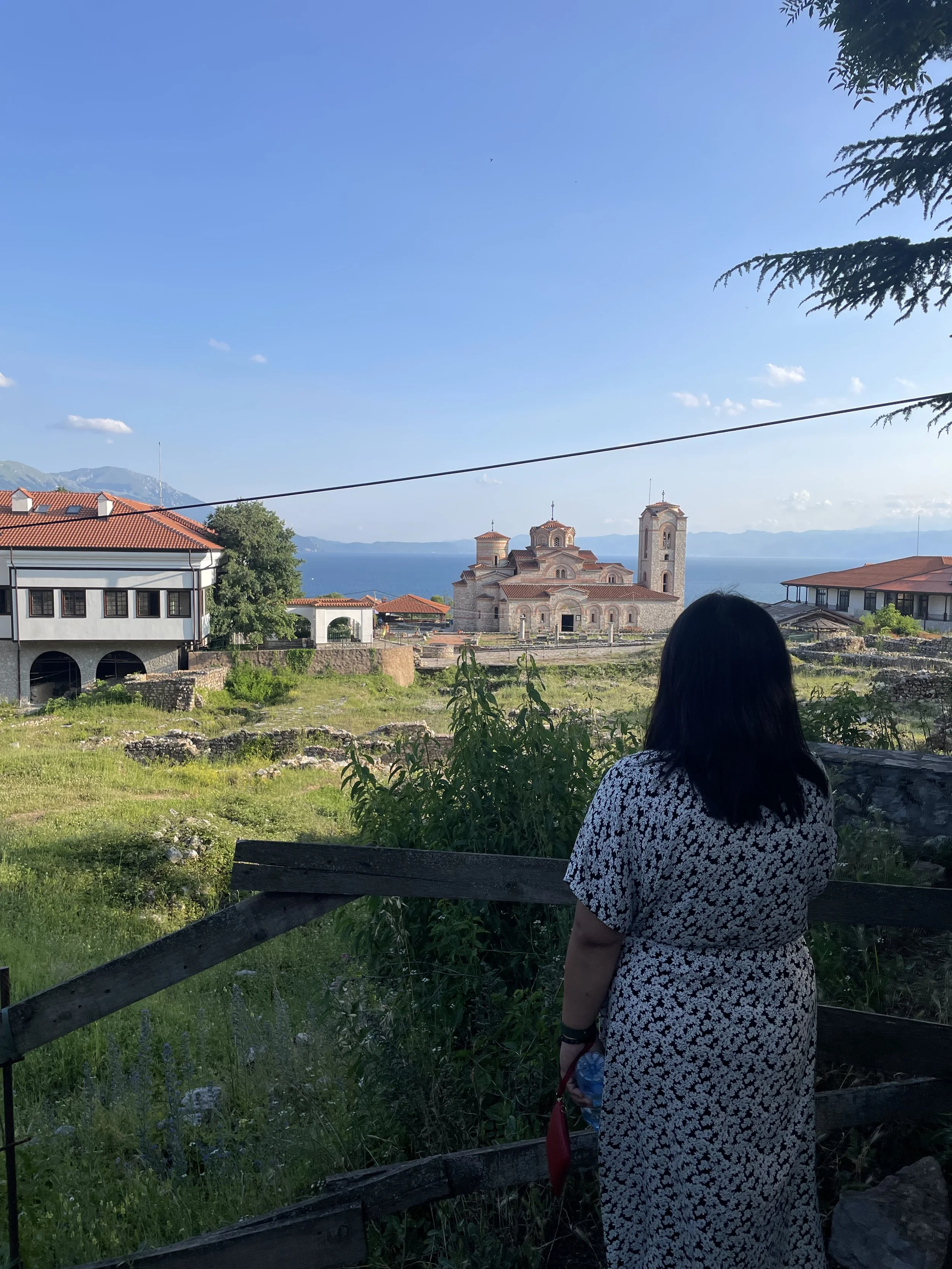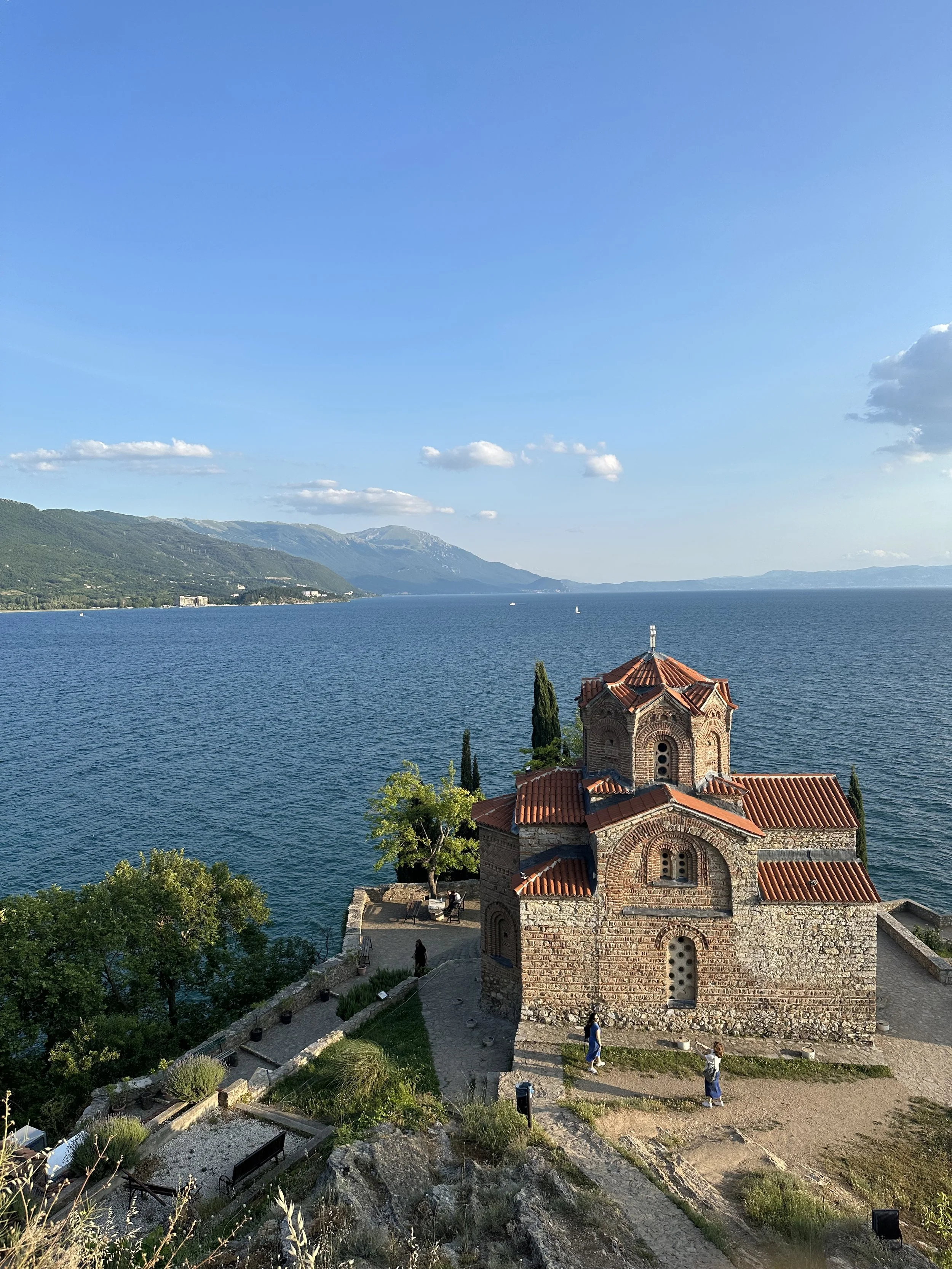 The church stands on its cliff above the lake. Thirteenth century. Small. Honest in its lines. The Kaneo viewpoint turned it into a social media icon because travellers kept using this angle to frame Ohrid on Instagram and in tourism campaigns. The stone stayed cool under the shaded arches. The water below pulled your eyes out toward the open lake and held them there.