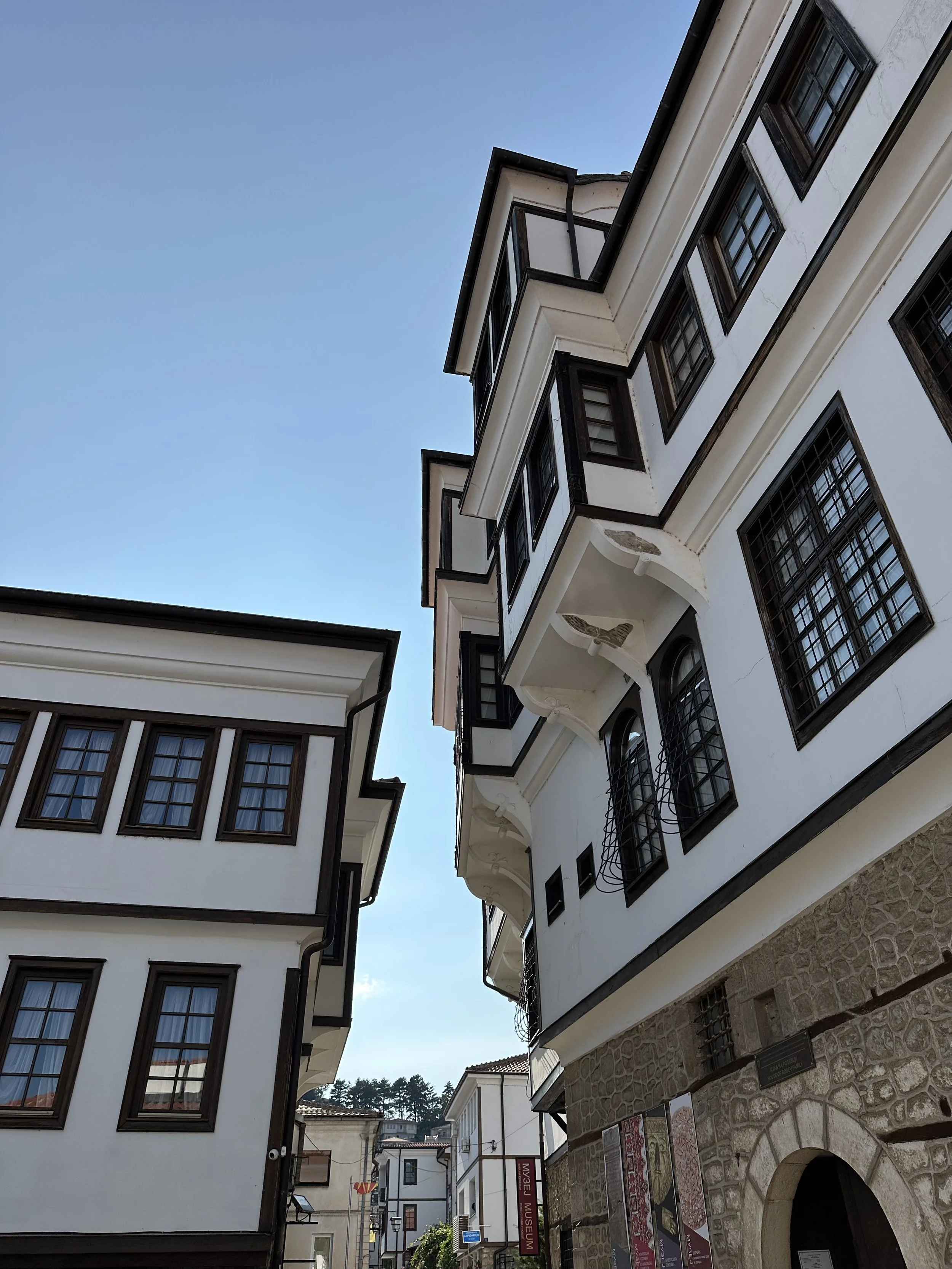 The Robev House stood above the lane with its black beams and white walls. It is one of Ohrid’s best surviving nineteenth century houses. Today it holds museum pieces, though I cannot confirm the full list. The façade alone tells a story. Wide windows. Deep eaves. A hint of Ottoman urban design. We paused in its shade, letting our eyes adjust.