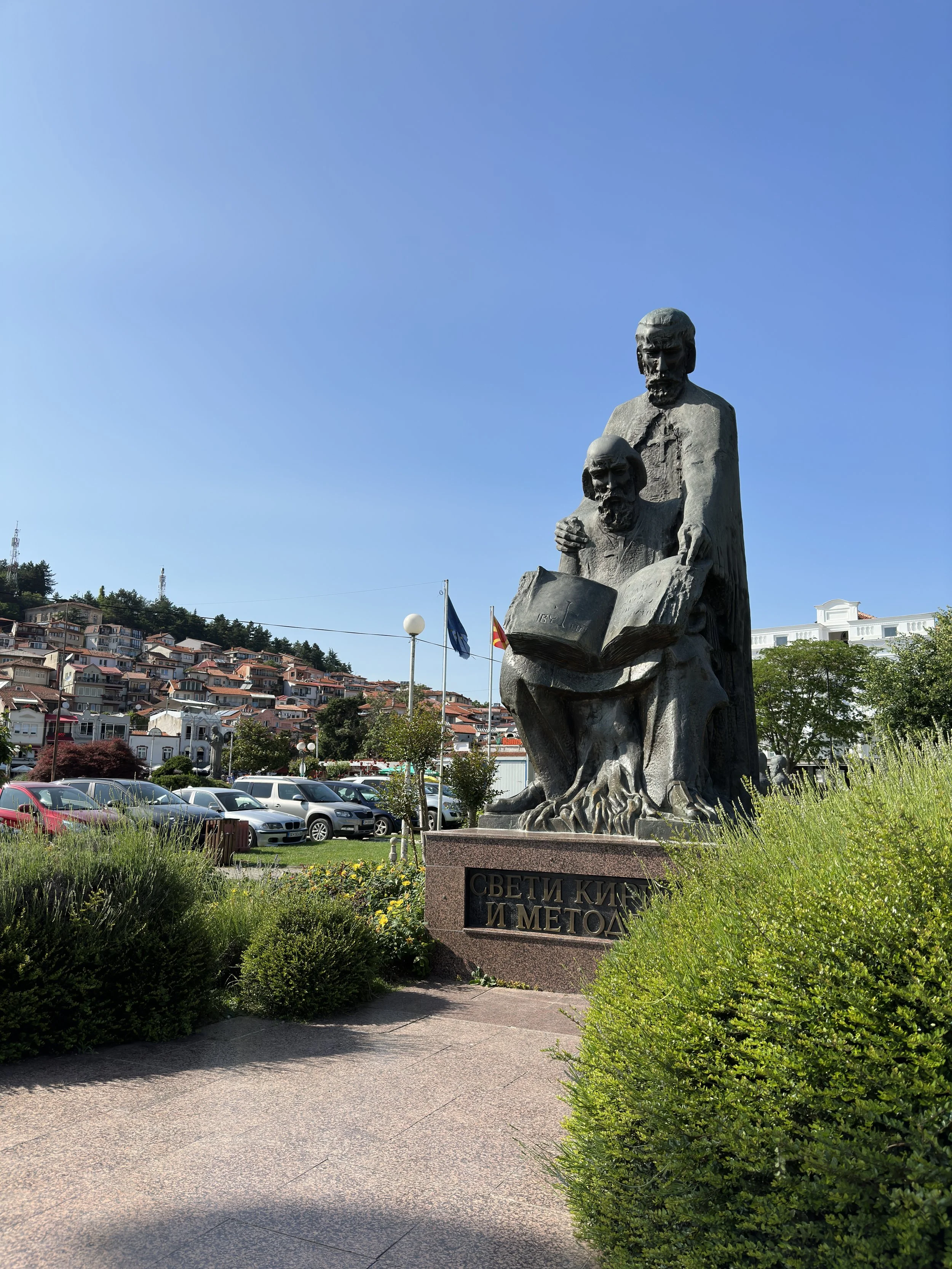 We started at the statues. The square felt calm. The lake breeze carried the smell of warm stone and dust. Our guide gave us a short primer on how these brothers shaped the alphabet that supported entire cultures. Their bronze robes caught the light. It felt like the right place to take the first step into the old town.