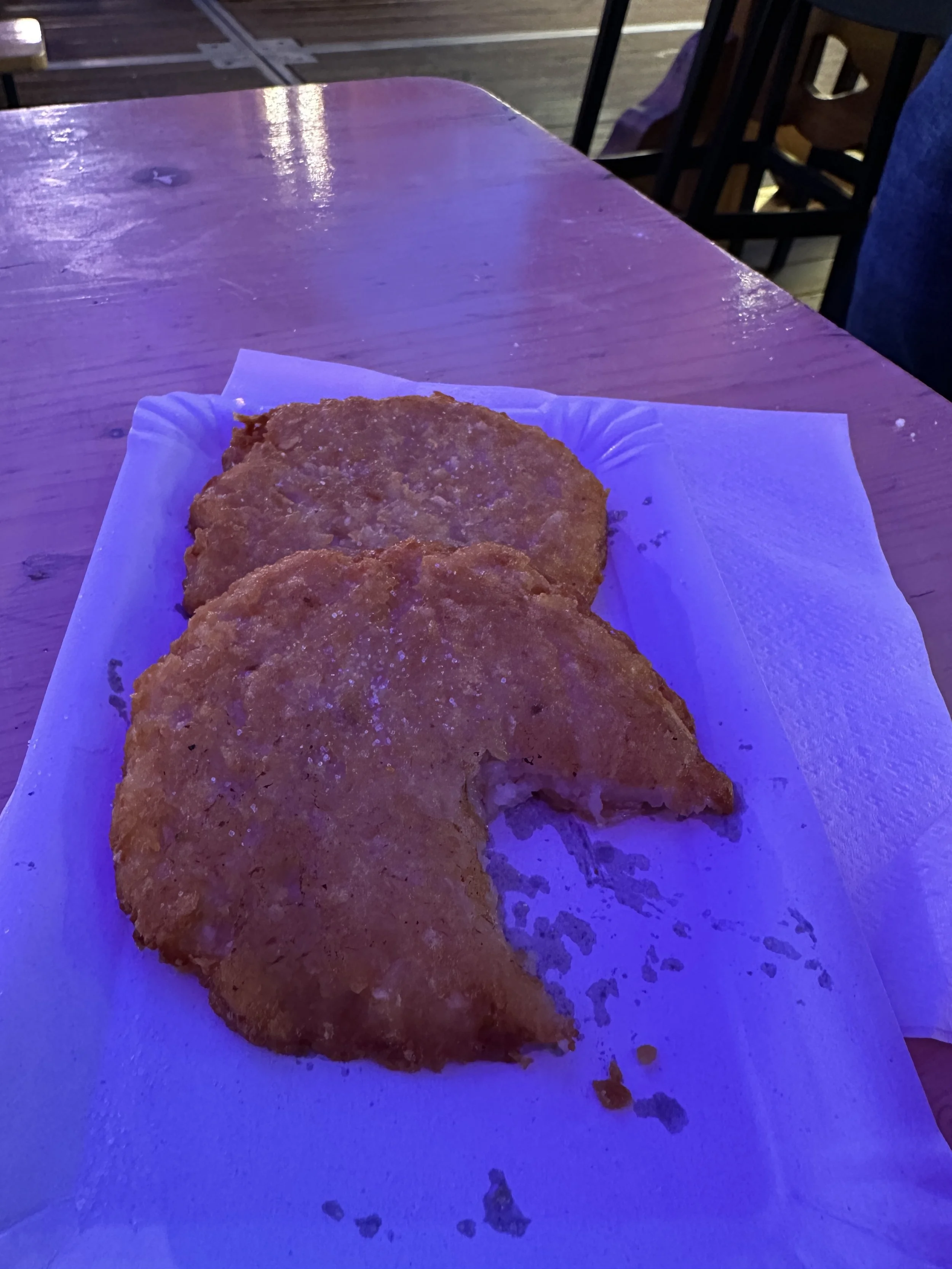 We wandered into the Christmas market at the Edouard André Municipal Park, also known as Kinnekswiss, and couldn’t resist the smell of freshly fried gromperekichelcher — Luxembourg’s famous potato pancakes. Crisp on the outside and soft inside, they came straight off the pan, hot enough to warm our hands as we walked through the stalls. The air smelled of spices and mulled wine, and the park sparkled with lights and music. It felt like the perfect festive stop between exploring and eating our way through the city.