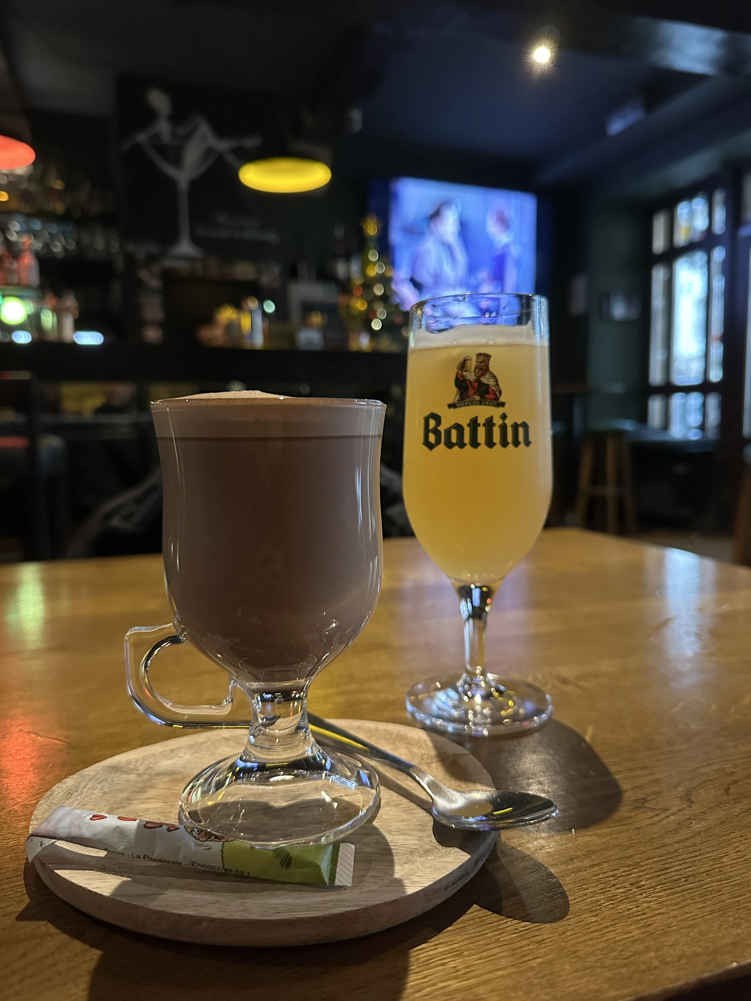 At the oldest pub in Luxembourg City, I savoured a rich hot chocolate while Nick had Battin beer - a local beer. The pub’s dark wooden interiors and vintage décor made it feel cozy and historic, a place to sit back, soak in the atmosphere, and enjoy a slow drink.