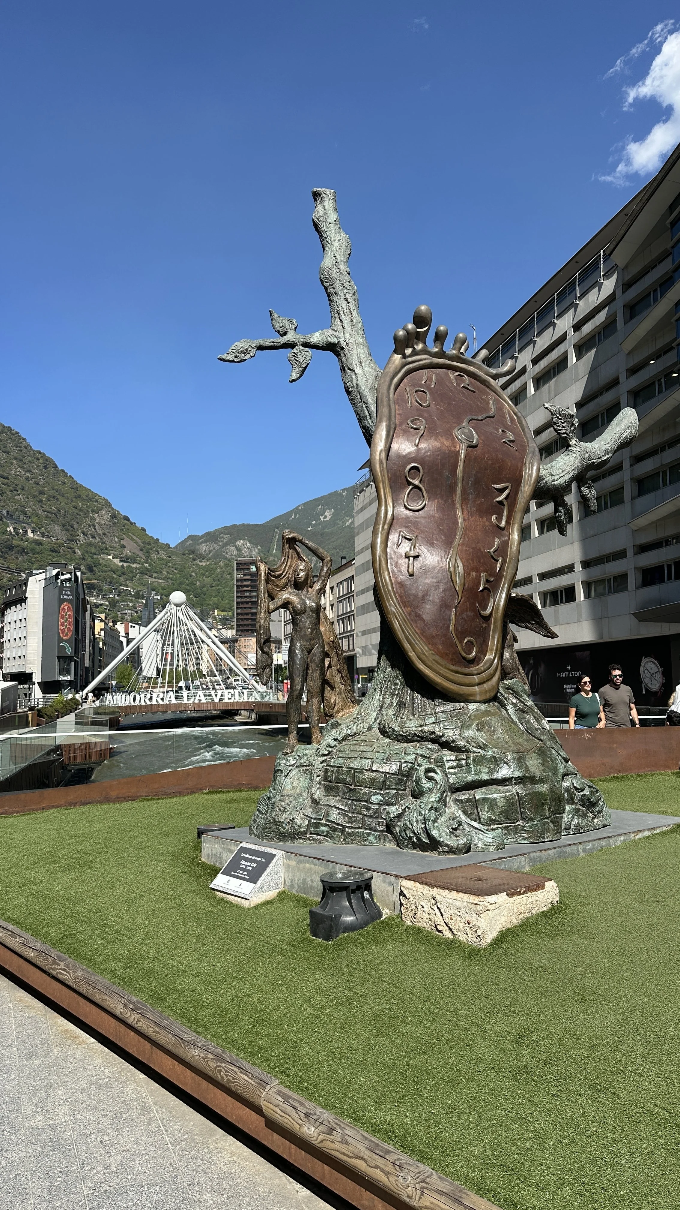 As you leave the old quarter, stay on the Avenue Meritxell, you will be walking past shops and restaurants. Once you reached Plaça de la Rotunda, you’ll spot La Noblesse du Temps, a surreal Salvador Dalí sculpture of a melting clock draped over a tree branch, symbolising the passage of time. This is a very popular spot for selfies. We had to wait a while to take ours. On that same area, there is a selfie stand where you can take your photo for the Andorra la Vella sign on Pont de Paris.