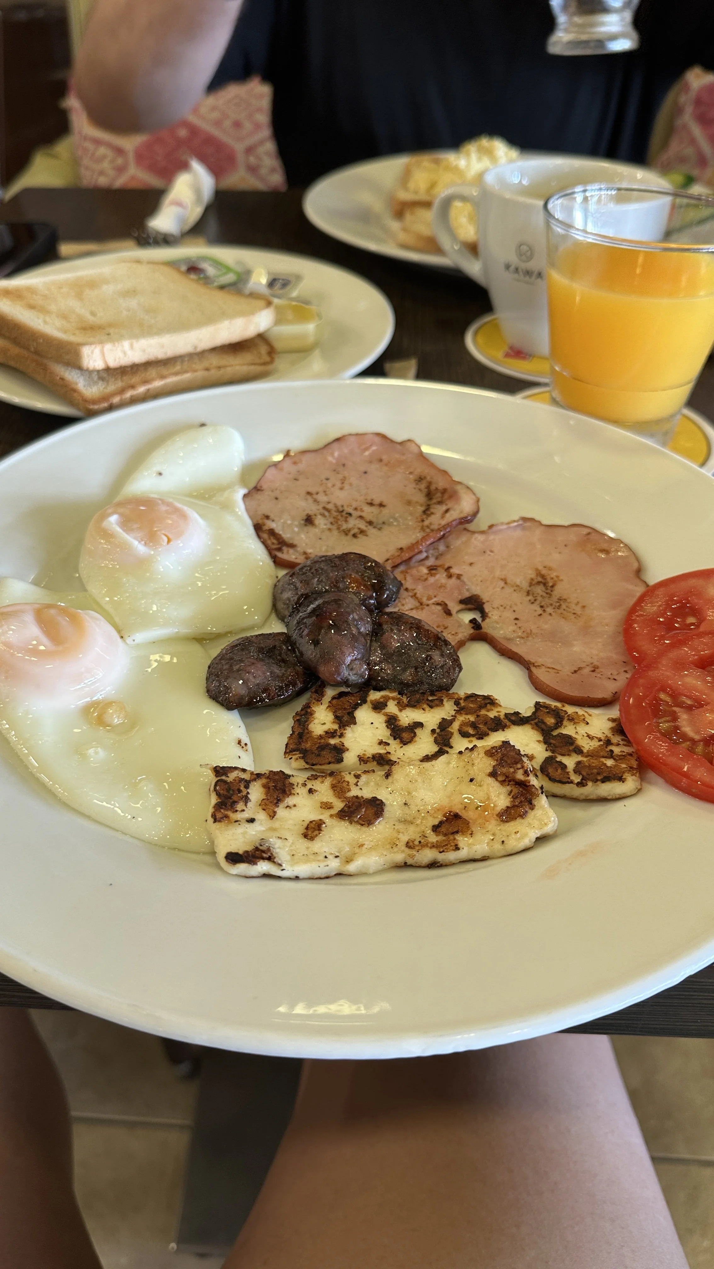 We kicked off one morning at The Tuck Inn on the Finikoudes promenade. I went for the Cypriot breakfast—grilled halloumi with its delightful squeak, smoky lountza, fried eggs, fresh tomatoes and cucumbers, olives, crusty bread, butter and jam. It was all washed down with fresh coffee and orange juice that tasted like sunshine. My husband kept it simple with scrambled eggs and toast, enjoying the same drinks. It was a filling start that set us up nicely for the day ahead.