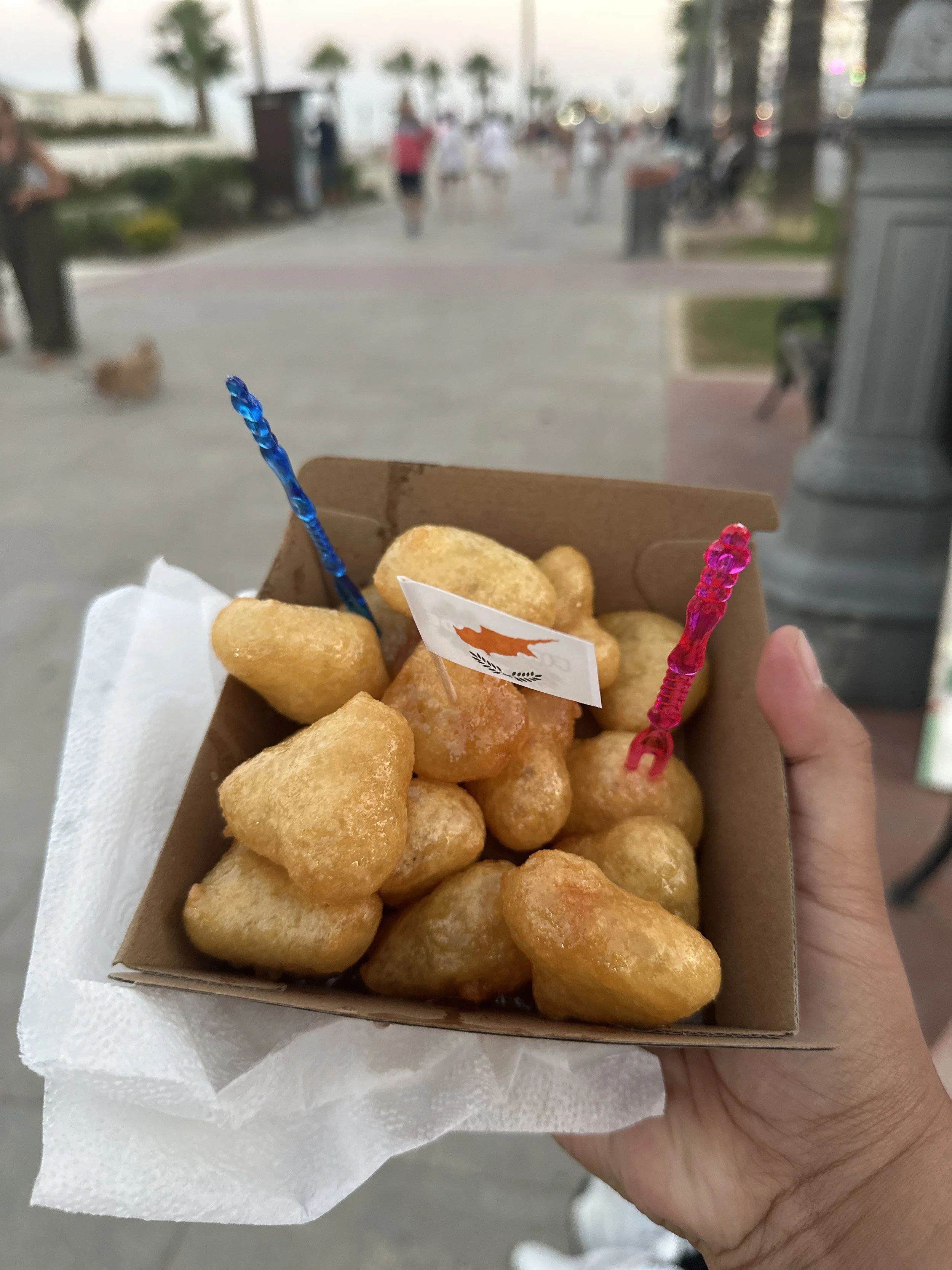 We couldn’t resist grabbing some loukoumades from Oh My Loukouma on the promenade. There was a short queue and we waited about 15 minutes because they make them fresh to order. The classic Yiayia version came drenched in sticky Cypriot honey—golden, fluffy doughnut balls that were sticky, sweet, and completely addictive.